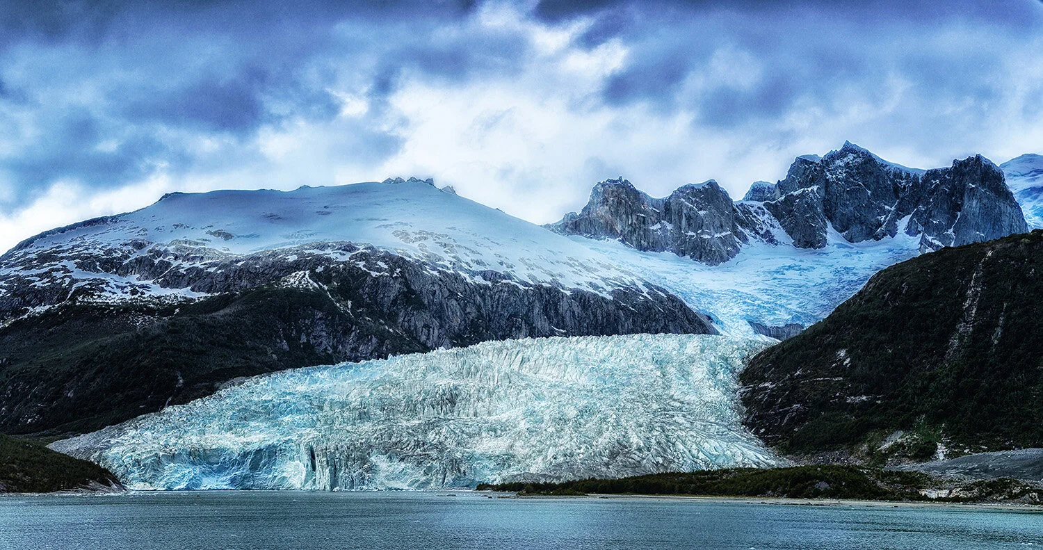 Panorama of Pia Glacier off northwest arm of Beagle Channel in the Darwin Range in Patagonian Chile.