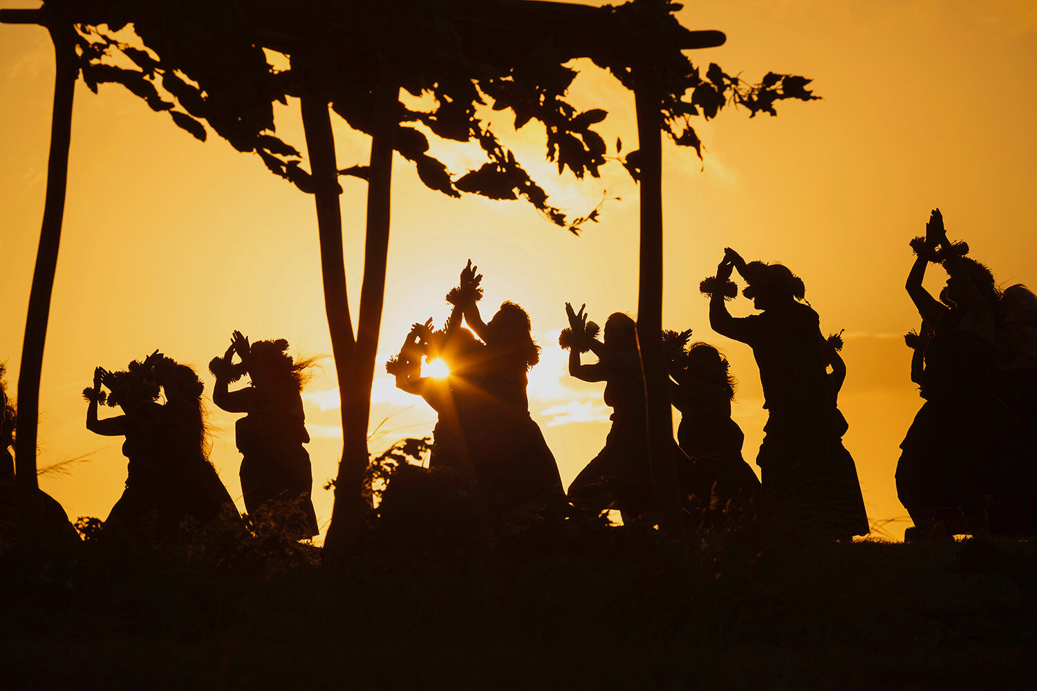 Sunrise Hula performance directed by Kumu Keala Ching at Ka’ana, Mauna Loa on Moloka’i, legendary site of Laka, goddess of hula. Mural print in collection at Mayo Clinic, Rochester, MN in memory of Julia A. Rosekrans, MD who is silhouetted in dance.